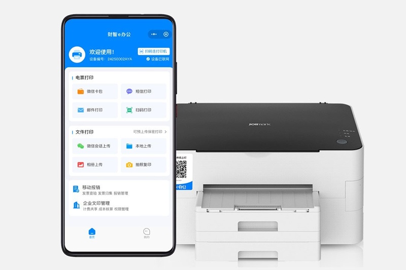 扫描打印机前方二维码进入小程序,即可实现在手机上打印各类电票、文档或照片,甚至是移动报销管理。
