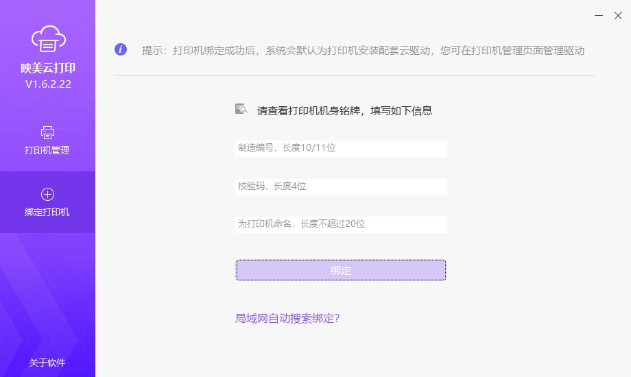 步骤2:安装并打开软件后,需绑定打印机。填写打印机的制造编号、校验码、以及命名打印机,即可完成绑定。