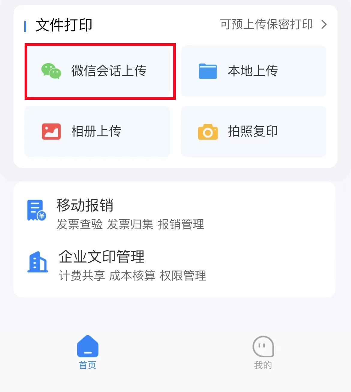 ① 扫码机身二维码进入财智e办公小程序,选择“微信会话上传”,找到目标文件所在位置并选中上传。