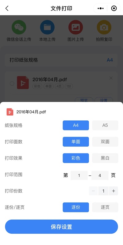 ② 上传后可直接选择“立即打印”,也可预上传后延后打印。此外,还能点击“设置”,自定义纸张规格、单/双面、打印效果、打印范围及打印份数等参数,适配不同打印需求。