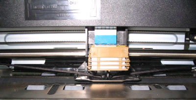 步骤三:如下图所示,将色带芯放进"打印头"与"色带导片"之间并且将其挪到最里面。