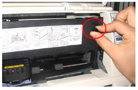 步骤四、如下图所示,将色带定位卡推进“打印头”与“字车架导纸片”之间。